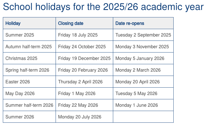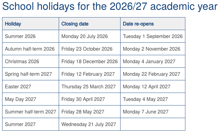 Please visit the Durham County Council website to view or download the school holidays dates for this academic year and next year for all community schools, special schools and voluntary controlled schools. Please note that voluntary aided (church) schools, foundation schools and academies may have set different dates and you should check with the school or academy to confirm their arrangements or view the PDF for schools not following the standard term and holiday dates.